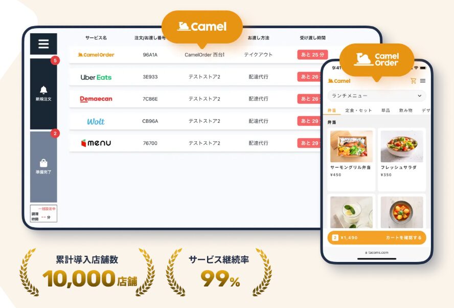 デリバリーを行う飲食店の業務効率をアップさせる一元管理サービス「Camel」。Camelはデリバリーを扱う飲食店オーナーの管理業務の負担を減らし、店舗オペレーションも軽減させ、効率的に店舗運営をおこなう為の最適なツールです。Uber Eats、出前館、Wolt、menu、ロケットナウなどの各社のタブレットを1枚におまとめ。品切れ時の一括停止や一括再開も1度の操作で完結。すべての情報を一元管理することで、無駄な作業を減らし、売上を最大化させてくれます。